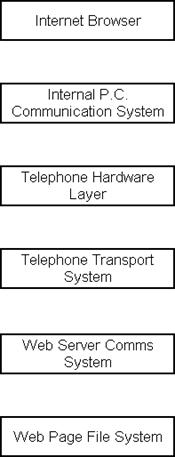 In the diagram above the system needed to display web pages on your P.C. has been split up into layers. The top most layer, the application, is one layer. From the application to the web page file system (where the web pages are actually stored) the ‘system’ is split into layers of software and hardware that perform similar functions. Each layer has a logical function in the system.